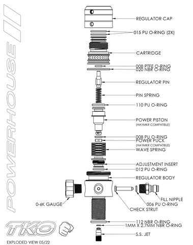 The TKO is a precision adjustable competition regulator (400psi - 650psi). It is factory pre-set at 450 PSI. Powerhouse uses wave spring technology and a stainless steel temperature resistant insert with their all new "POWER PUCK", that gives the regulator rock solid consistent air flow that is ultra easy to maintain. A rotational locking cartridge combined with low profile burst disks allows the user to custom fit how the regulator gauge and fill nipple lines up on their marker, eliminating any wrist discomfort. With the superior performance it offers, it€™s no wonder why so many top teams choose PowerHouse!