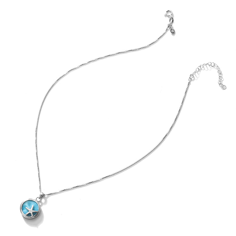 An adorable silver starfish on a circle of Larimar.